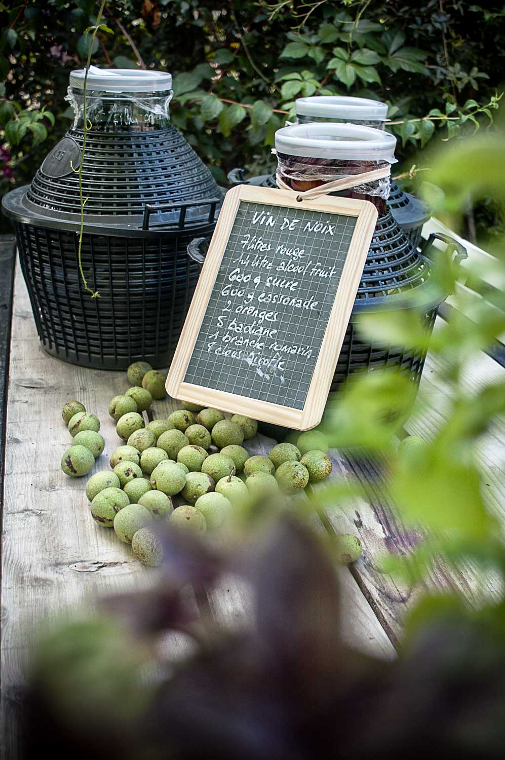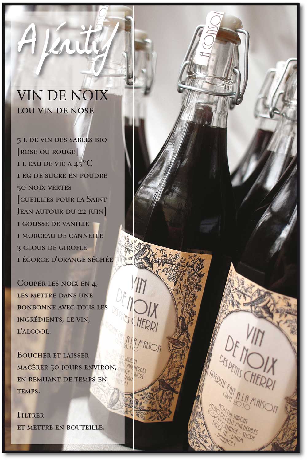 Pour la venue des amis chanteurs ESTELLE et BERNARD ISARD (le Duo AIR FAMILY) je fais péter les bouchons du vin de noix réalisé avec le noyer de LA TABLE à RALLONGE (un des très rares encore présents dans le GARD!) en 2012. On l’a goûter hier pour l’inauguration des tables d’hôte des MERCREDIS (ouvertes au public autour d’un jambalaya camarguais… faites passer le message!)… et on est encore scotchés, ébaubis, stupéfaits, sous le charme… comment le dire? Vous nous direz.