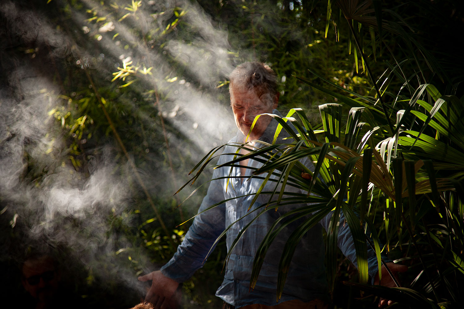 8H30, Faut reconnaître que ces shamans sont foutrement bons pour repérer les coins sympas. Ils ont choisit une clairière reculée, nichée au cœur du parc et le petit feu qui va bien nous attend, entouré d'un cercle de cérémonie fait de plumes et de fleurs. On installe les nattes, couvertures- coussins en cercle et chacun s’assoit autour du couple-médecine...