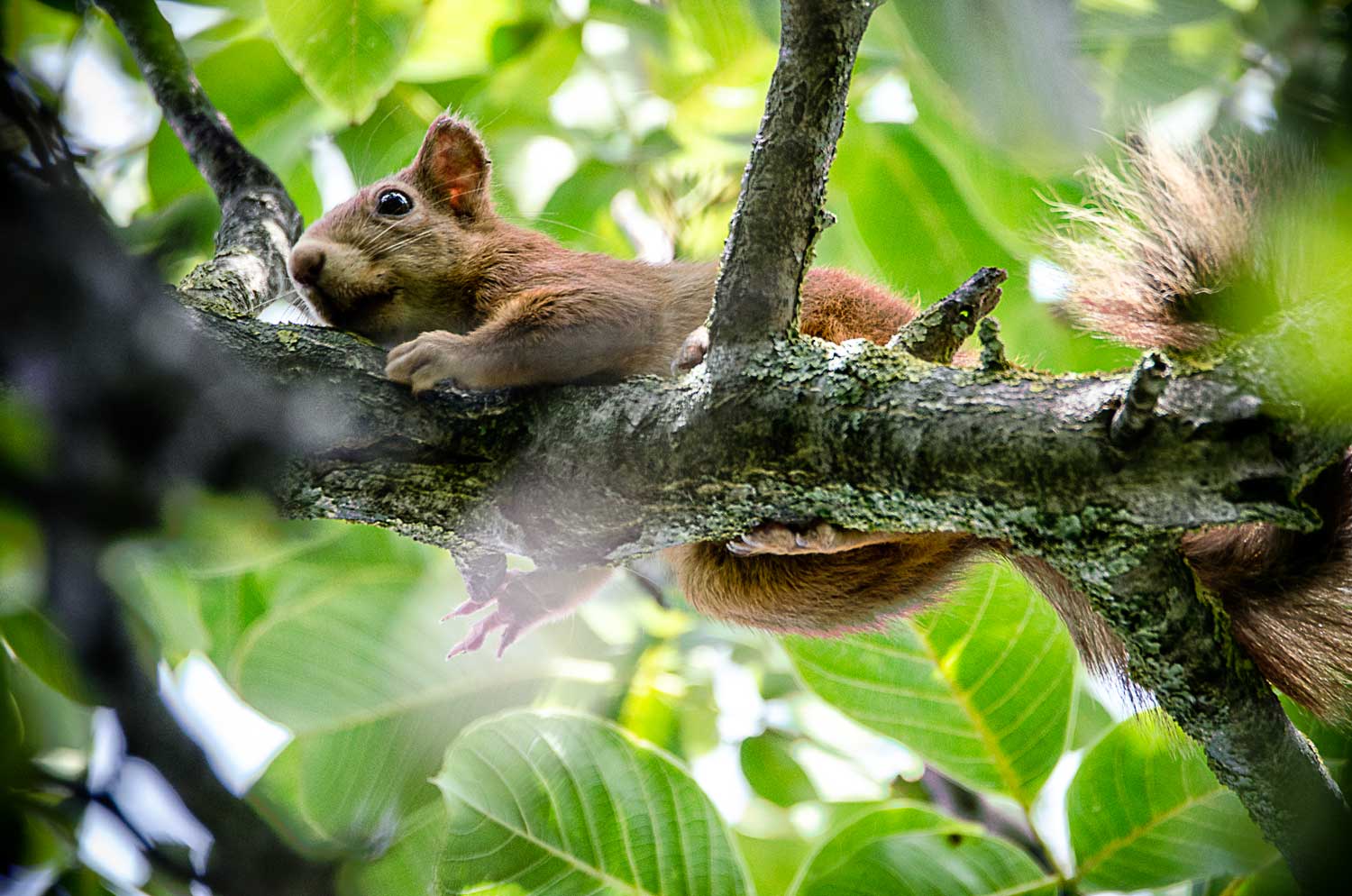 Et lorsque les brisures de caramel "Daim" sont arrivées sur le plan de travail pour la préparation du bavarois caramel, on a entendu le glapissement de Pipo, l'écureuil qui niche dans le noyer (vous savez celui qui donne les noix du vin de noix que l'on va déguster à l'apéro!). Alors puisque l'appareil photo couche dans la cuisine (faut bien de temps en temps photographier un joli plat!)autant en profiter pour vous présenter ce petit coquin.